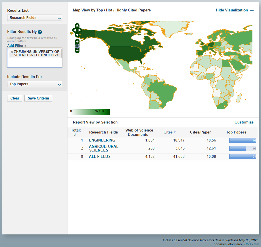 据科睿唯安(Clarivate)2025年5月发布的最新一期《基本科学指标数据库》(Essential Science Indicators,简称ESI)统计数据显示,我校农业科学学科(Agricultural Sciences)首次进入ESI全球排名前1%,标志着学校该学科进入国际高水平行列。这是继工程学学科后,学校第2个进入ESI全球前1%的学科。