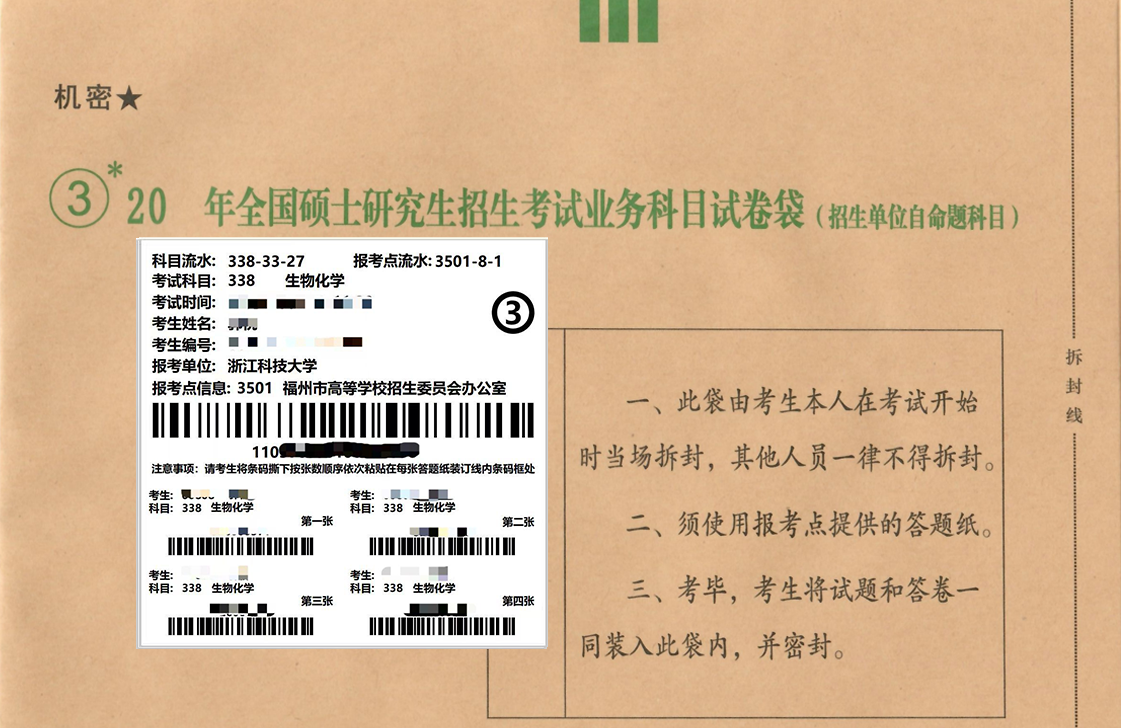 考生拿到全国硕士研究生招生考试自命题试卷袋后,请认真核对信封上的报考单位、报考点信息、考生编号、姓名、考试科目、考试时间等信息,核对无误后再粘贴条形码(个人信息勿撕,如下图所示)。