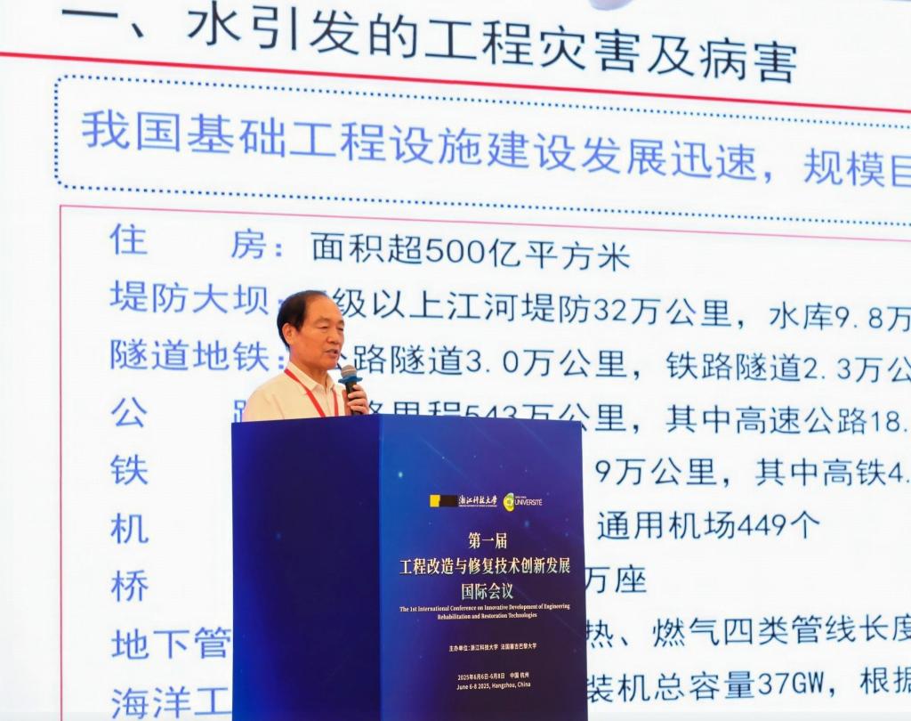 本次会议紧扣国家“十四五”规划重大决策部署和“双碳”战略目标,旨在工程改造与修复领域向安全、耐久、绿色、低碳的高质量发展,促进该领域的国际学术交流与合作。中国工程院王复明院士、刘汉龙院士,全国工程勘察设计大师王立军,南方科技大学陈建飞教授等多位国家级高层次专家学者出席会议,来自国内外高校、科研院所、行业企业的专家学者和工程技术人员等300余人参会。浙江省住房和城乡建设厅二级巡视员江胜利、浙江科技大学副校长李其朋分别致辞。