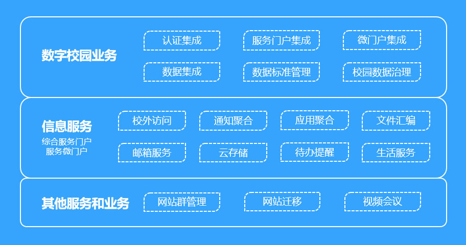 作为信息化服务的重要窗口,综合服务门户、服务微门户为全校师生提供了通知聚合、应用聚合、文件汇编、邮箱服务、云存储服务、待办提醒等多种一站式信息化服务。师生不但在校内高效、便捷的享受服务,也可以通过统一身份认证平台+校外访问系统实现校外访问,数字校园信息化服务已做到无时不在、不出不在。
